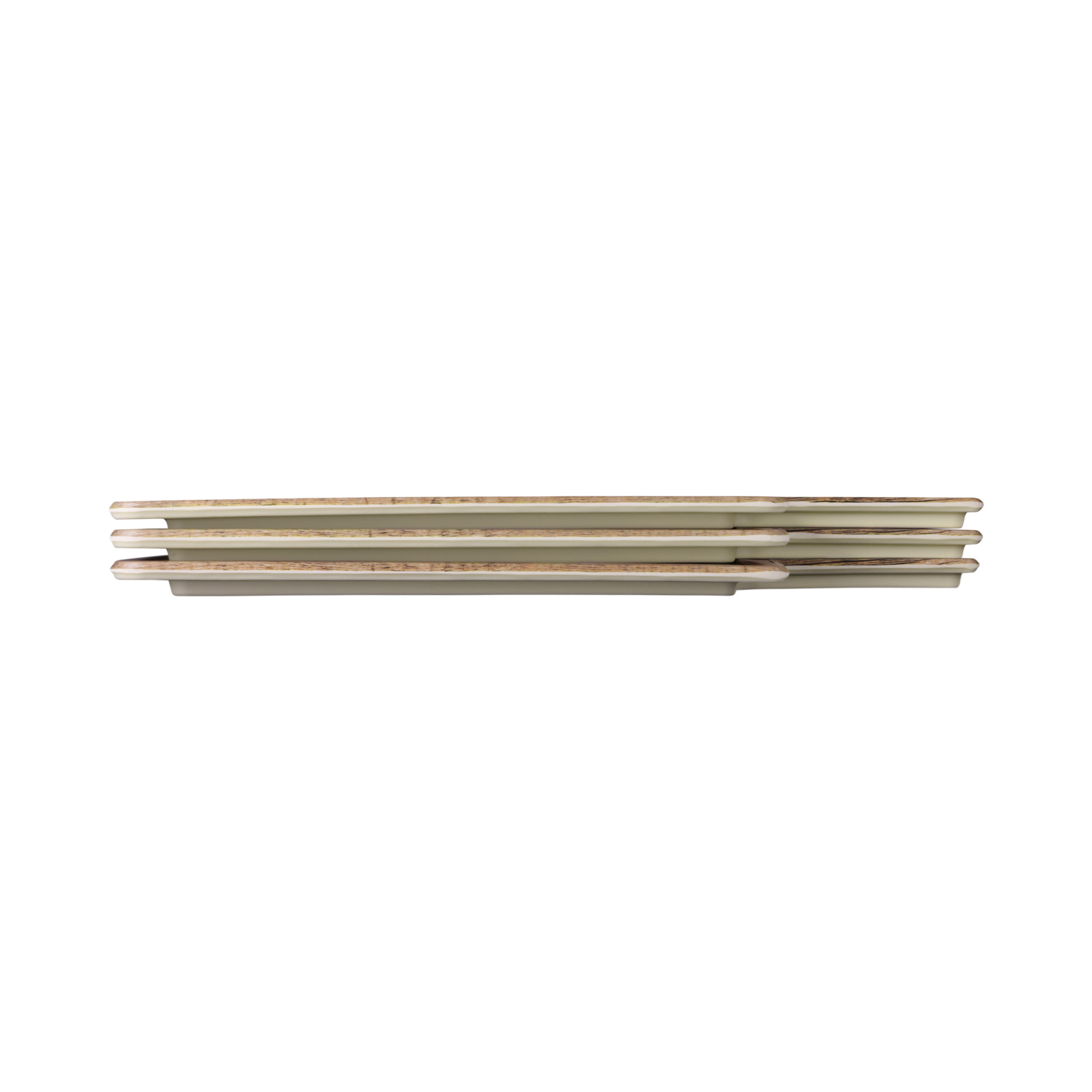Imagine Fo Bwa, a faux wood melamine collection, with the look and feel of real wood. The matte finish gives the products a realistic appearance without the porous bacteria trapping qualities of real wood.